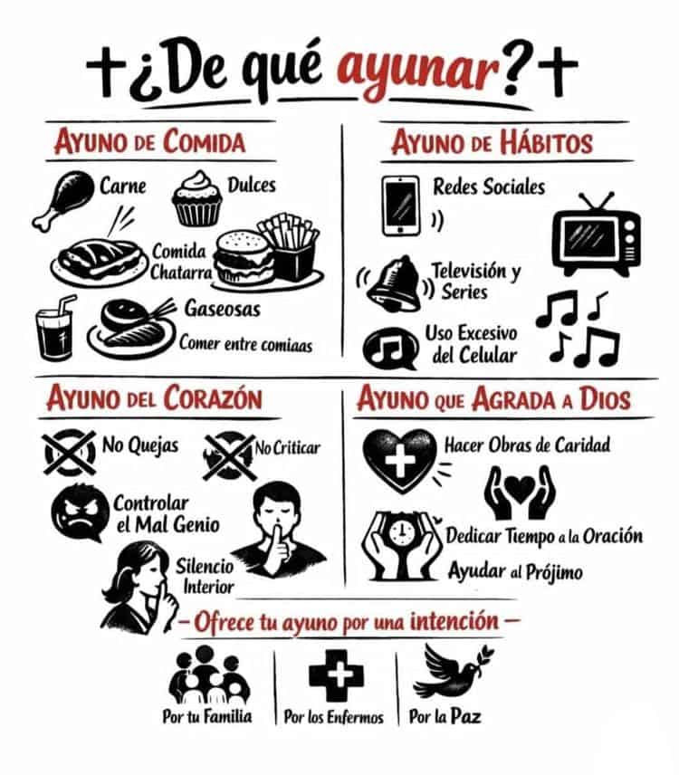 Especialistas en pastoral recuerdan que la oración y la limosna suelen ser prácticas más fáciles de comprender, pero el ayuno exige disciplina y claridad de intención. Puede enfocarse en alimentos, hábitos o actitudes; lo esencial es que no sea una práctica vacía, sino un acto consciente orientado a la conversión.